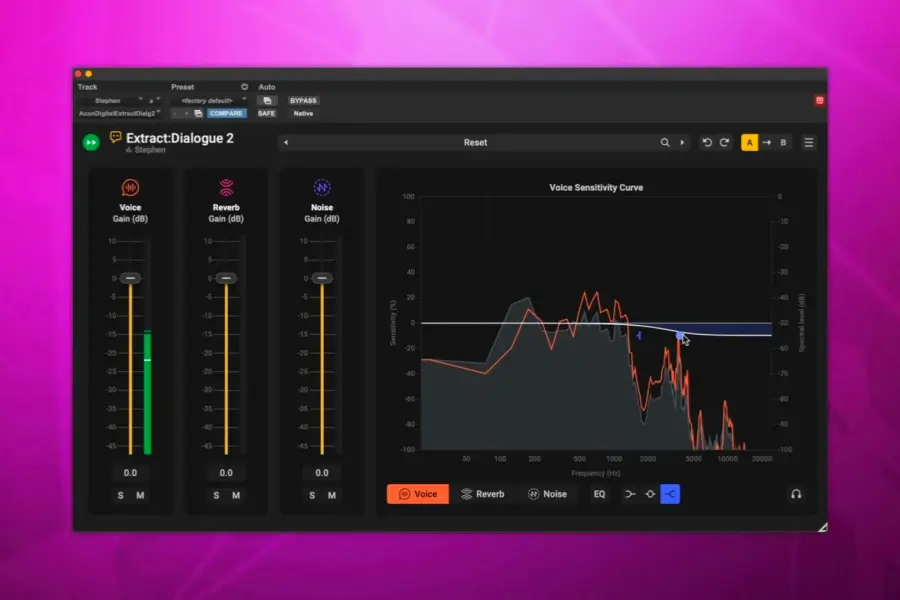 - 将音频拆分为三个独立通道 — Voice / Reverb / Noise。每个通道你都可以单独调节音量 (mute / solo)、灵敏度 (sensitivity)、以及对频率的适配 (可以对高频、低频、特定频段分别施加处理),提供非常细致和灵活的控制。