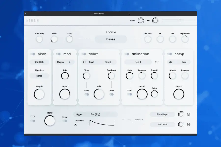 插件内置 LFO 与包络调制,可将调制信号分配到多个参数上,使混响在时间维度上持续变化。这一点使 AIR Ether 更接近声音设计工具,而非单一效果器。