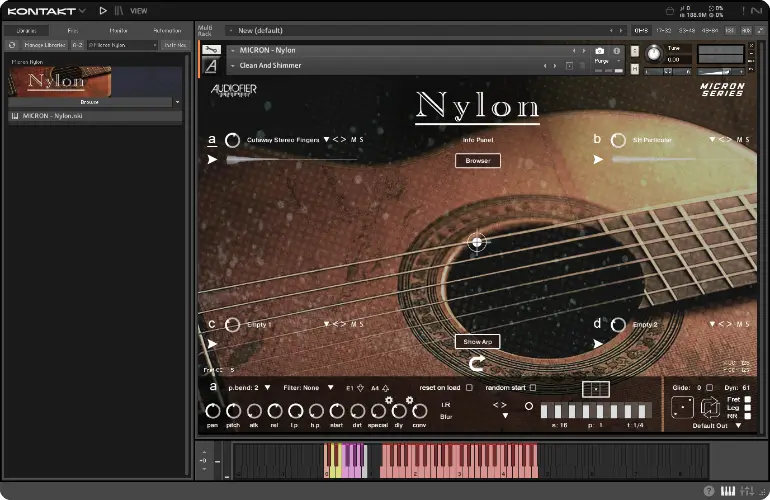 Micron Nylon 在设计上融合了多个音源与处理层,以实现从真实古典/尼龙弦吉他音色到氛围化、实验化声景的多重表达。