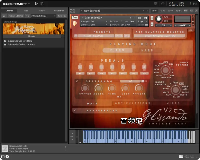 - 真实录制竖琴音色:采用专业录音环境与多种演奏技巧采样,包括平滑滑奏(glissando)、分散和弦、单音连奏等。