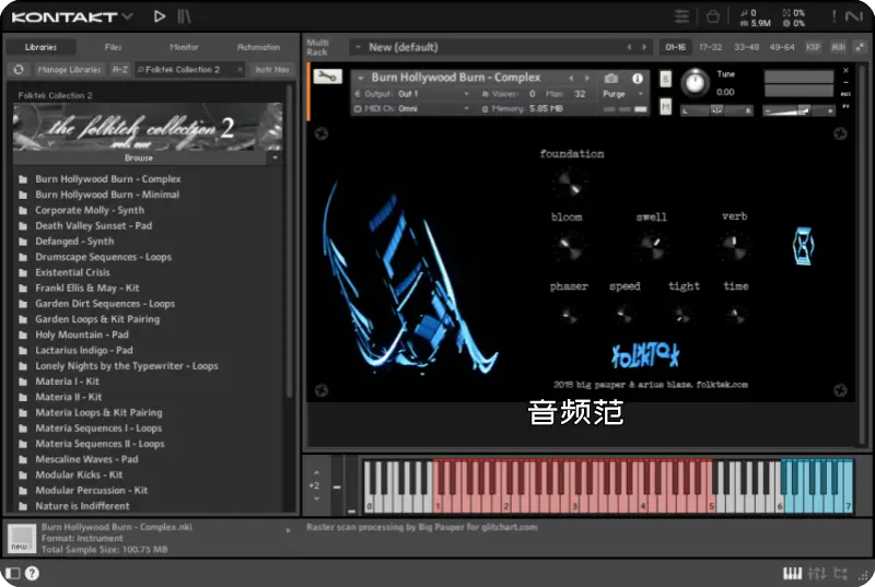 Folktek The Folktek Collection Volume 2 是 Folktek 发布的第二辑声音素材合集,定位为富实验性、动态质感强的声音库,适用于电子音乐制作、声音设计和合成器/采样器创作环境。它继承了 Folktek 声音创作体系的核心理念:利用物理模型、混沌系统与模块化方法生成复杂、变异性强的声响元素。