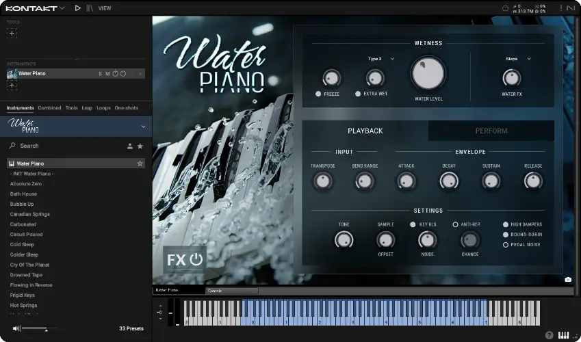 Water Piano 是 Impact Soundworks 与音频创作者 Mattias Krantz 合作推出的一款极具实验性的钢琴音源。制作团队将一架三角钢琴注满约 34 加仑(约 128 升)清水,并在从“干燥”到“完全浸没”的不同水位下录制每个琴键。