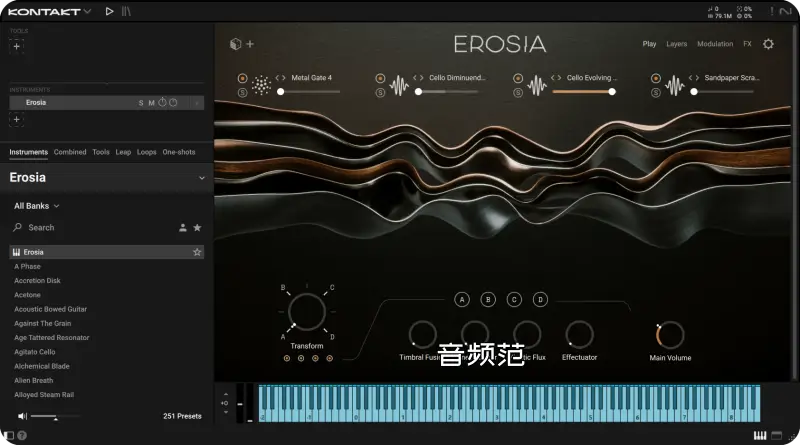 Native Instruments Erosia 是 NI 于 2025 年推出的 影视级声音设计引擎(Kontakt 音色库),主打将摩擦、张力、变形、碎裂等物理声响,转化为动态、有机、充满叙事感的电影音景。