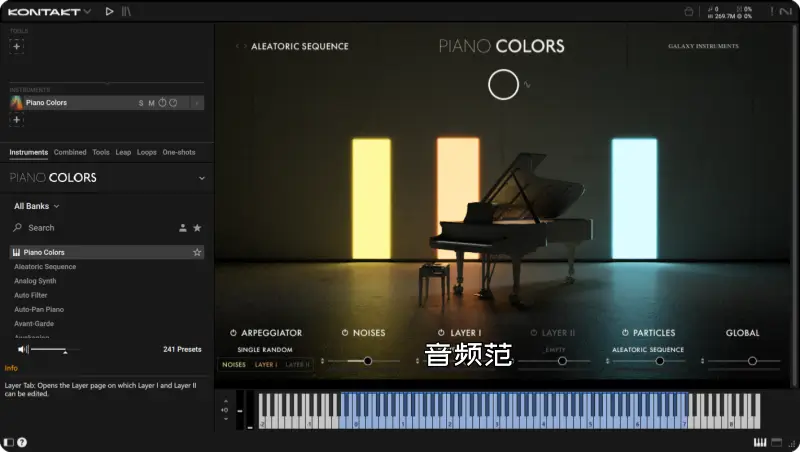 Piano Colors 是 Native Instruments 推出的 前卫钢琴声音源,基于采样与创新引擎结合的设计,主要用于制作富有表现力、动态变化和色彩质感的钢琴类音色及衍生音色。它是 KONTAKT(或使用免费版 KONTAKT PLAYER 6.5.3 及更高版本)平台上的一个专业虚拟乐器库。