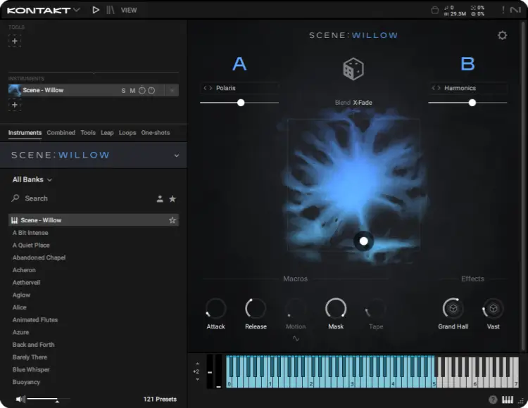 Scene: Willow 是由 Native Instruments 推出的 “Scene 系列”(Scene Series)的一款专注于电影/媒体配乐场景的虚拟乐器。它通过一组冰冷、空灵、带有冬季氛围感的音色(如调音打击、飘渺人声合唱、冰冻弦乐纹理)来营造“静谧冬日”“雪落无声”“冰面反射”这一类画面感非常强的声音场景。