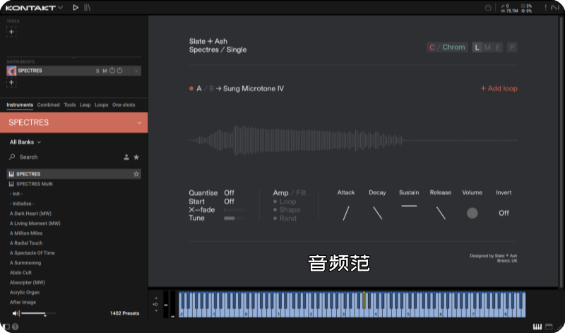 Spectres 是 Slate + Ash 推出的一款高度实验性的 Kontakt 虚拟乐器,核心面向电影配乐、当代古典、实验音乐与声音设计。它并不以还原传统乐器演奏为目标,而是专注于探索扩展演奏技巧、非线性结构与光谱化纹理,用于构建具有空间感、情绪张力和抽象特质的声音层。