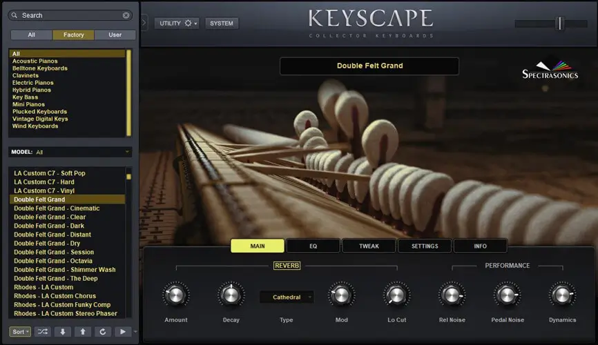 - Keyscape 收录大约 36 款键盘模型,涵盖从经典至稀有的电钢琴与键盘乐器。