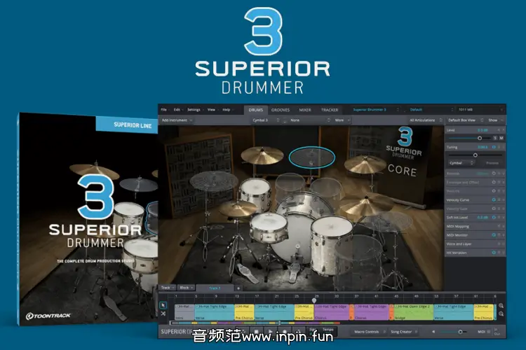 Superior Drummer 3 是 Toontrack 的旗舰级鼓制作工作室插件,被定位为“虚拟鼓室 (virtual drum production studio)”。它集成了庞大的采样库、高级混音引擎、音频到 MIDI 转换功能和强大的编辑工具,适合用于录音、混音、声音设计和作曲。