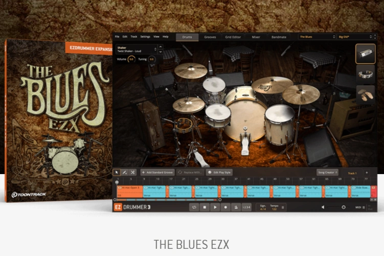Toontrack The Blues EZX 是一款专为 EZdrummer 设计的扩展音色库,包含了两套完整的鼓组,分别来自不同的时代:一套是 1970 年代的 Gretsch,另一套是 1940 年代的瑞典 Levin。此外,它还提供了一系列现代的钹和一些特别的乐器,如手提箱和牛皮鼓圈。这些音色都经过了精心的录制和混音,以呈现出浓郁的蓝调风格和氛围。