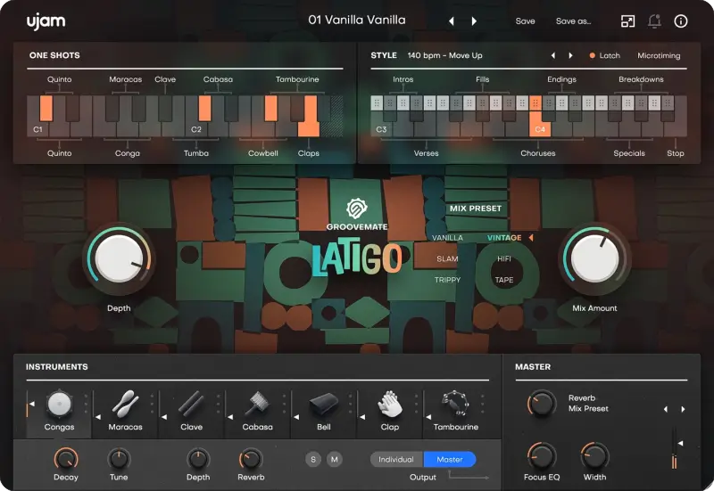 uJAM Groovemate LATIGO 是 uJAM 于 2026 年 3 月 25 日 推出的拉丁打击乐虚拟乐器插件,基于 Groovemate ONE 架构升级,主打即用型、真实感、高混音友好的拉丁律动,快速为流行、拉丁、电子、摇滚等风格叠加地道打击乐层。