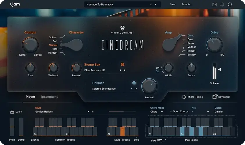 uJAM Virtual Guitarist CINEDREAM 是一款面向影视、氛围与现代混合风格音乐的智能吉他伴奏工具,帮助制作人快速构建自然、情绪丰富的吉他声部,同时提供可控参数以适应多种制作场景。