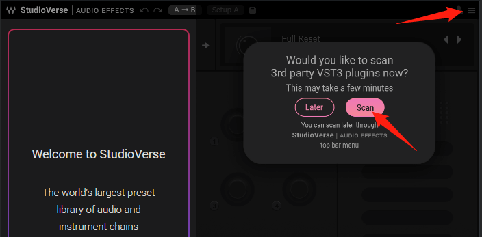 首次打开会出现上图所示,点击Scan扫描VST插件(如果没有提示,点击插件右上角三条线,选择手动扫描);