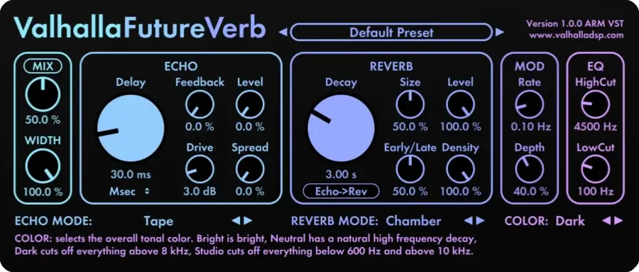 Valhalla FutureVerb 是最新推出的混响与回声结合型效果器,主打“未来感空间设计”和“快速创造独特氛围”。它延续了 Valhalla 一贯的简洁界面与高品质算法,是一款同时适合混音与声音设计的混响/延迟插件。