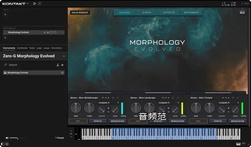 Zero-G Morphology Evolved 是英国厂商 Zero-G 于 2026 年推出的 氛围 / 声景类混合合成器(Kontakt 专属),基于电子音乐大师 Ian Boddy 2004 年的经典采样库深度重构,主打动态演化声景、梦幻氛围、太空质感。